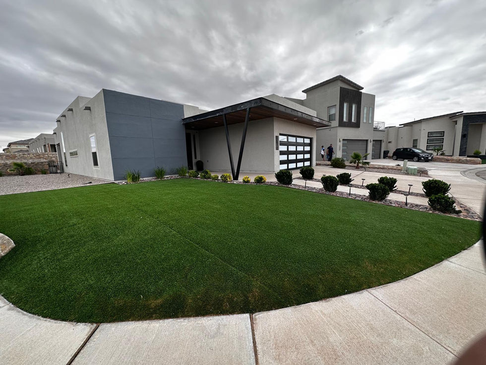 This stunning installation features a beautiful synthetic grass turf and creatively designed CMU planters that add a touch of greenery to any outdoor space. Get inspired for your own landscaping project.